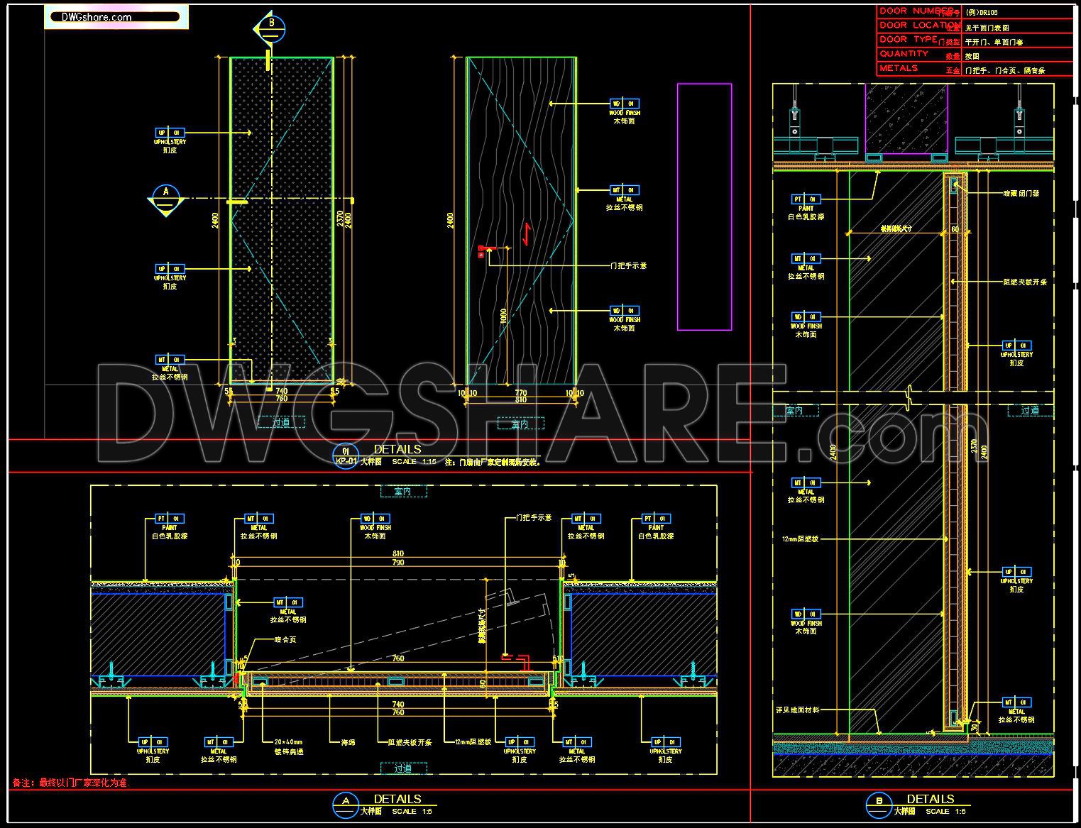 Construction Detail Drawings: Detailed components of the door structure, including the frame, mounting positions, and hinge assemblies, are meticulously illustrated. Realistic wood finishes are indicated, giving designers and builders a clear understanding of material application and aesthetic outcomes.