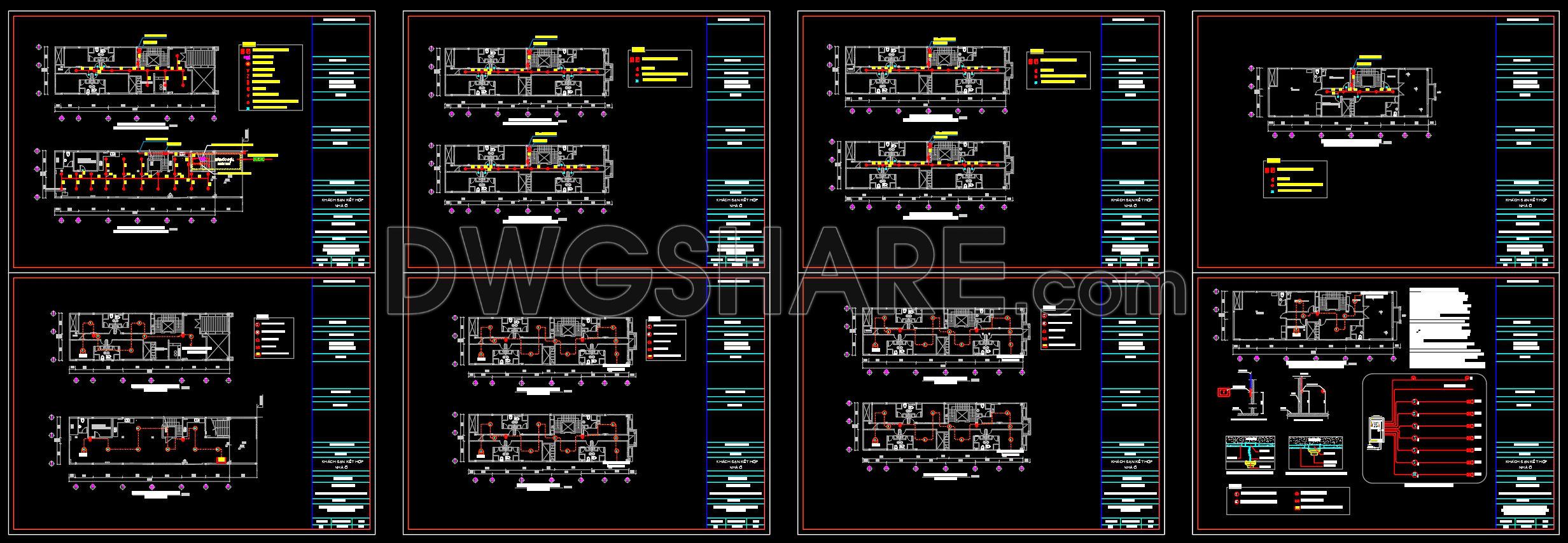 This CAD drawing set presents the design concept for a 5-storey mixed-use building combining a small hotel and residential units on a typical urban plot measuring about 8 × 27 meters. The layout reflects a practical approach often used in dense city environments where land is limited but commercial potential is high.