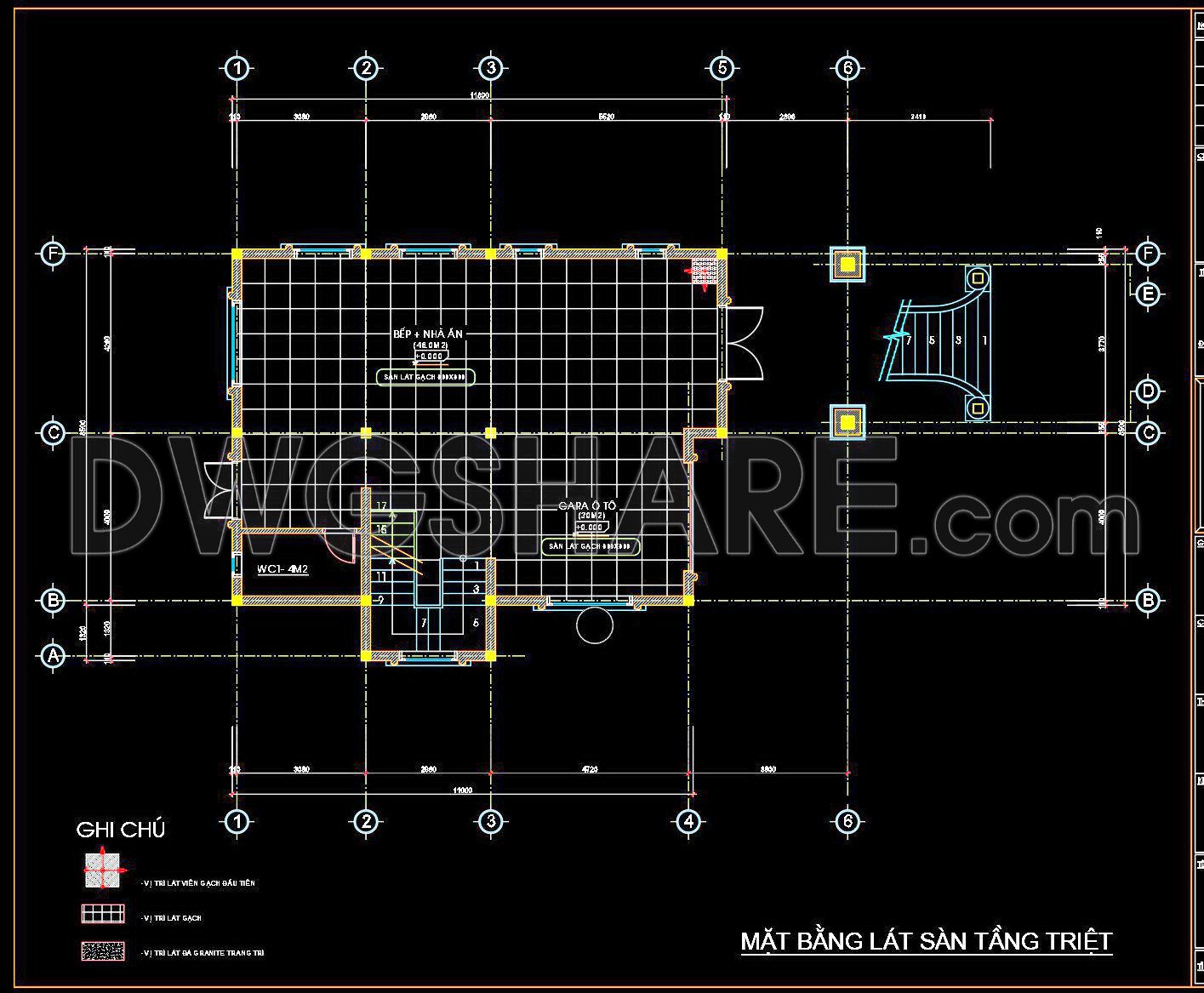 - 2nd and 3rd Floor Tiling Plans: Usually include bedrooms, study rooms, an ancestral altar room (if any), and private bathrooms. The tile arrangement may differ between rooms depending on their function and design intent. The staircase and hallway areas also have their own specific tile designs.