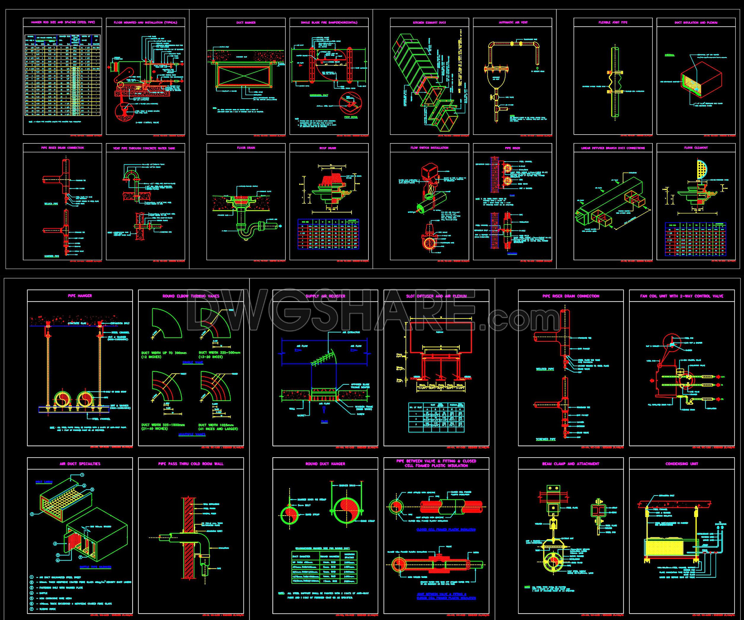 This drawing set brings together a comprehensive collection of MEP typical details essential for real-world design and construction. It covers everything from pipe hangers, hanger rod sizing, riser and drain connections, to HVAC installations such as floor-mounted AHUs, fan coil units with control valves, condensing units, flexible joints, and flow switch installations. The set also includes detailed air distribution and ductwork drawings—fire dampers, diffusers, air registers, duct hangers, insulation, plenums, turning vanes, and kitchen exhaust ducts—ensuring proper airflow performance and safety compliance. In addition, critical plumbing and drainage details like floor drains, roof drains, vent pipes through concrete water tanks, cold room wall penetrations, and floor cleanouts are clearly illustrated.