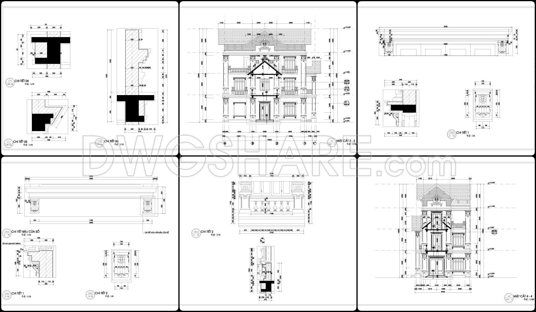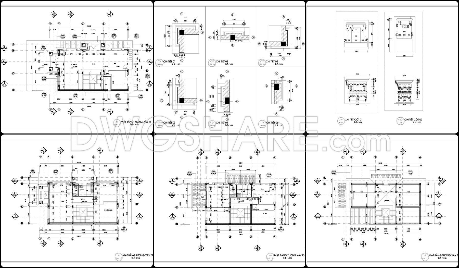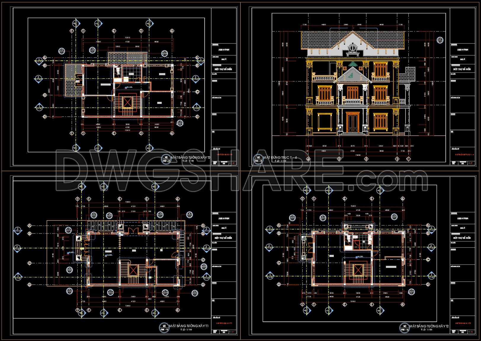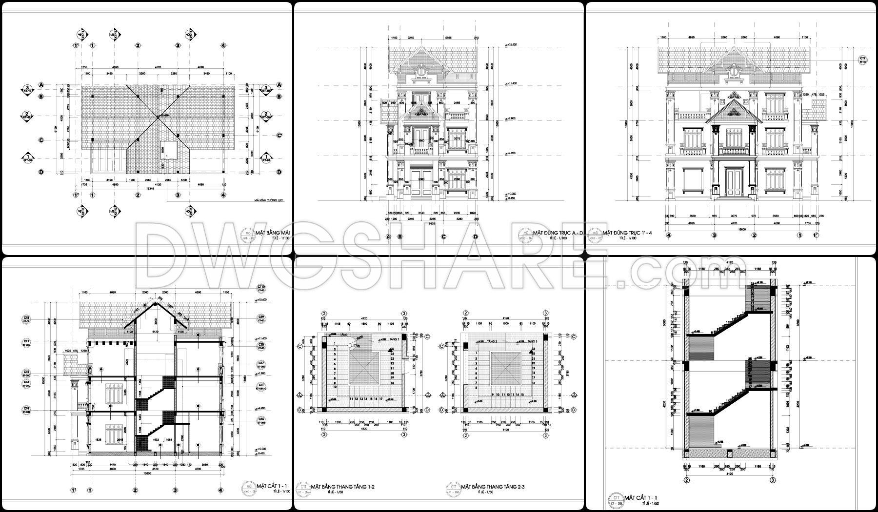 This drawing set presents a fairly clear design of a 2-story neoclassical villa, with a balanced layout that feels practical for construction. The floor plans are organized around a clean grid system, making it easy to understand wall positions, structural elements, and spatial relationships. The central area is dedicated to the main hall and staircase, acting as the core connection between spaces, while surrounding rooms are arranged to allow for natural light and ventilation.