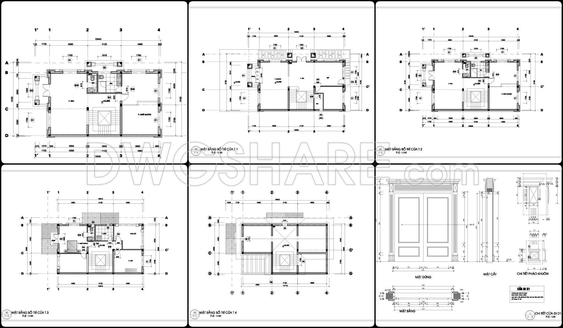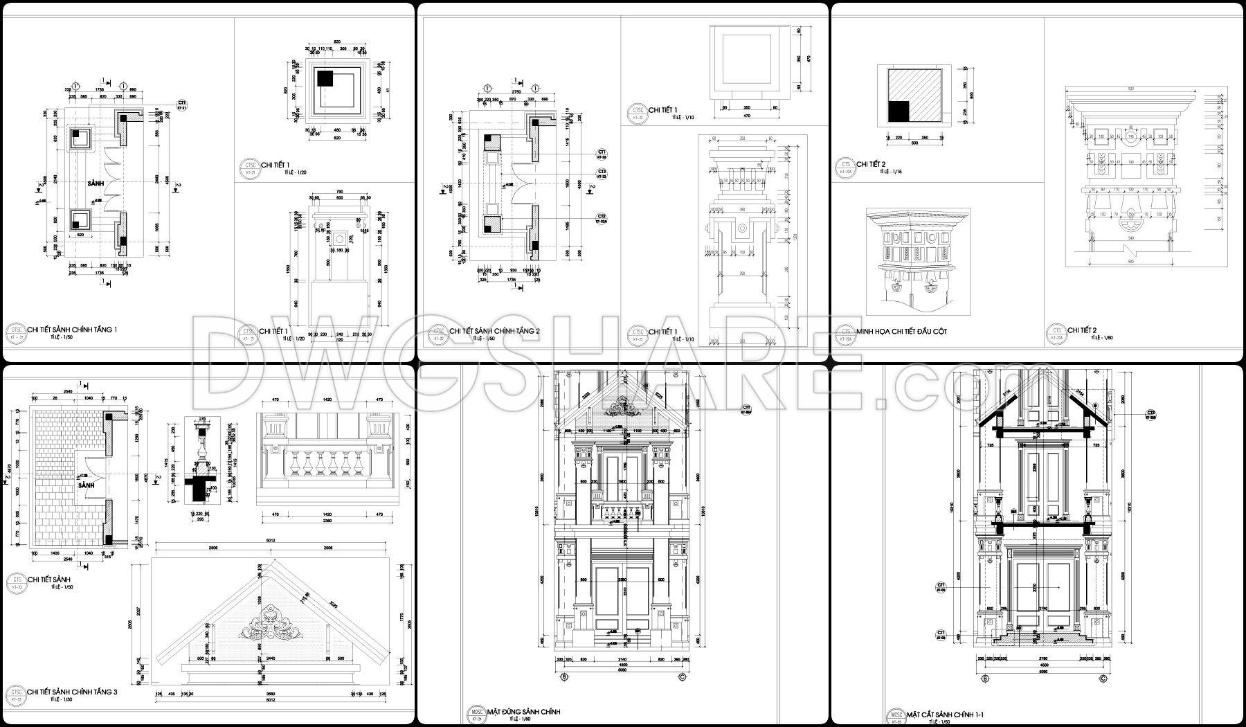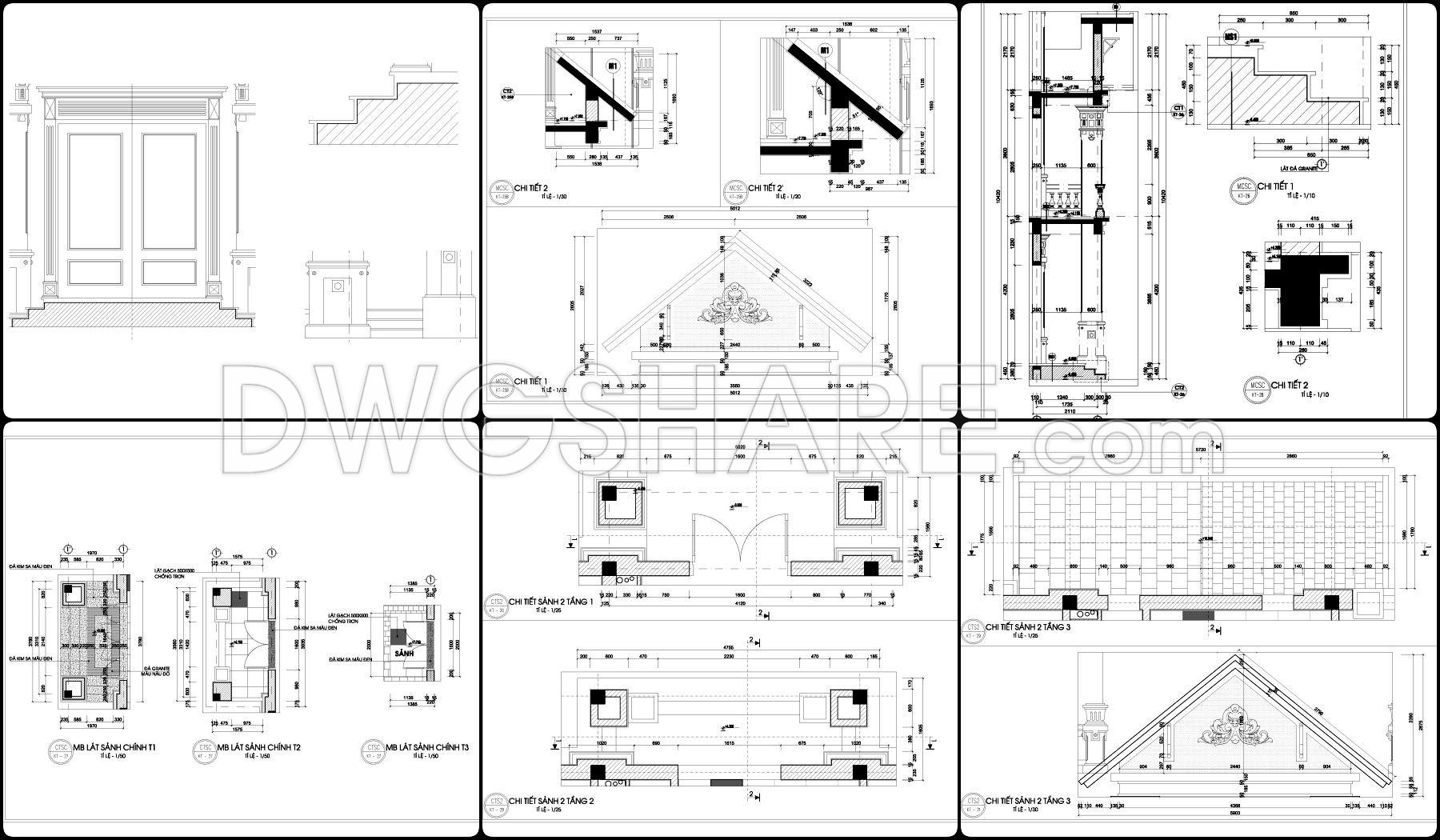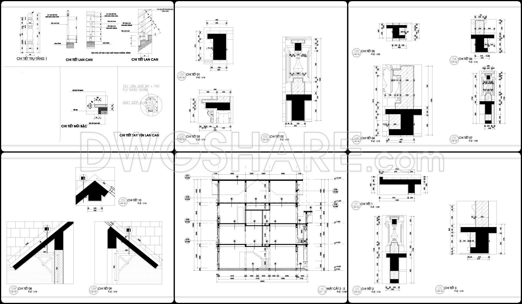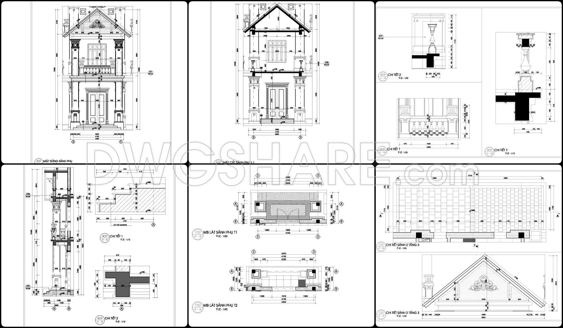 This drawing set presents a fairly clear design of a 2-story neoclassical villa, with a balanced layout that feels practical for construction. The floor plans are organized around a clean grid system, making it easy to understand wall positions, structural elements, and spatial relationships. The central area is dedicated to the main hall and staircase, acting as the core connection between spaces, while surrounding rooms are arranged to allow for natural light and ventilation.