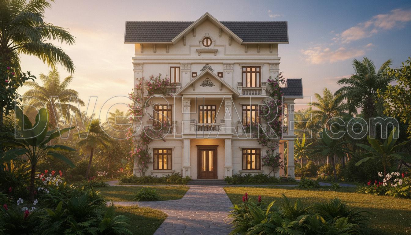 The front elevation emphasizes symmetry, featuring classical-inspired details like columns, moldings, and balconies without feeling overly decorative. The proportions between the roof, openings, and ornamental elements are handled quite well. Overall, this is a solid reference set for anyone looking for a villa design that is refined yet not overly complex.