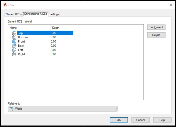 List 6 perpendicular coordinate systems as 6 basic projection planes which are defined in current drawing. The perpendicular coordinate systems are defined relatively in comparison with the determined UCS in the list “Relative To”.